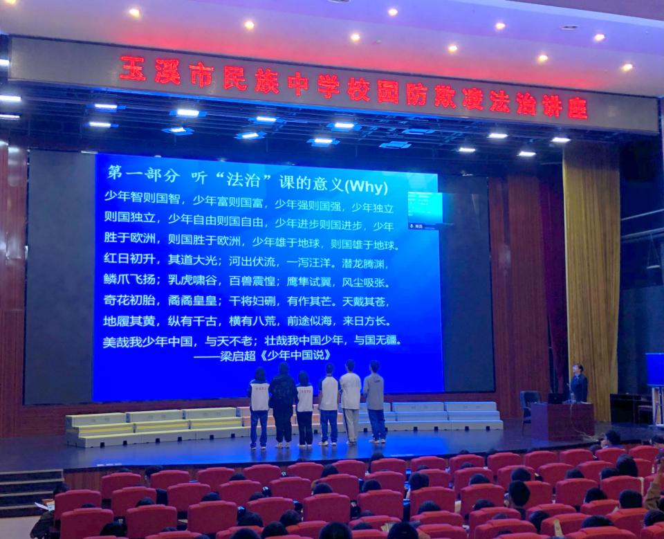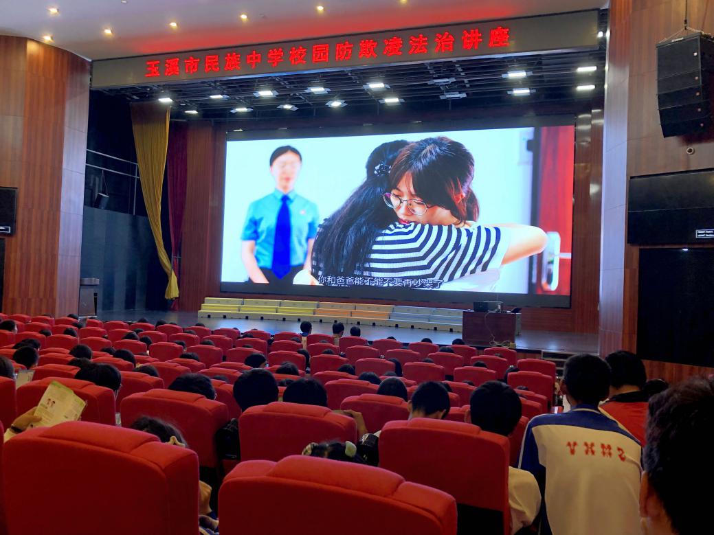 同学们踊跃参与互动、掌声不断,讲座受到了玉溪市民族中学师生的一致认可和高度好评。此次法治进校园也是市院首次按照《青少年法制教育大纲》尝试在授课中把法律的约束力量、底限意识与道德教育的感化力量、提升精神相结合,使未成年人理解法治的道德底蕴,树立正确的价值导向。